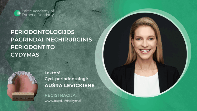 Kursus veda AUŠRA LEVICKIENĖ – gydytoja periodontologė. 2010 m įgijo gydytojo odontologo kvalifikaciją Kauno medicinos universitete. 2013 m. įgijo gydytojo periodontologo kvalifikaciją Lietuvos sveikatos mokslų universitete. Gydytoja dirba privačioje praktikoje ir specializuojasi konservatyvioje ir chirurginėje periodontologijoje, minkštųjų audinių plastikoje ir implantologijoje. Šiomis temomis veda praktinius kursus bei skaito paskaitas konferencijose. Yra Lietuvos periodontologų draugijos, EFP (European Federation of Periodontology) bei EADD(European Academy of Digital Dentistry) narė.
